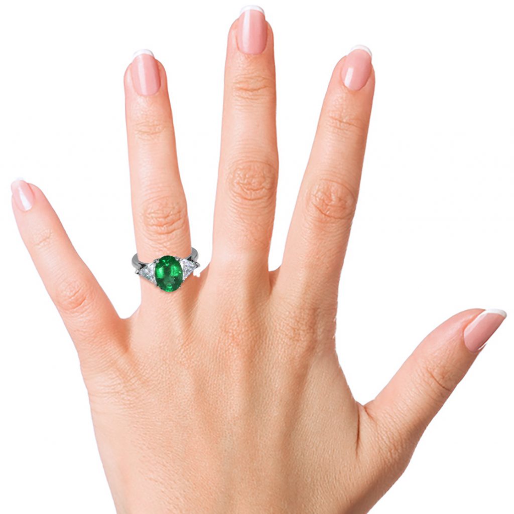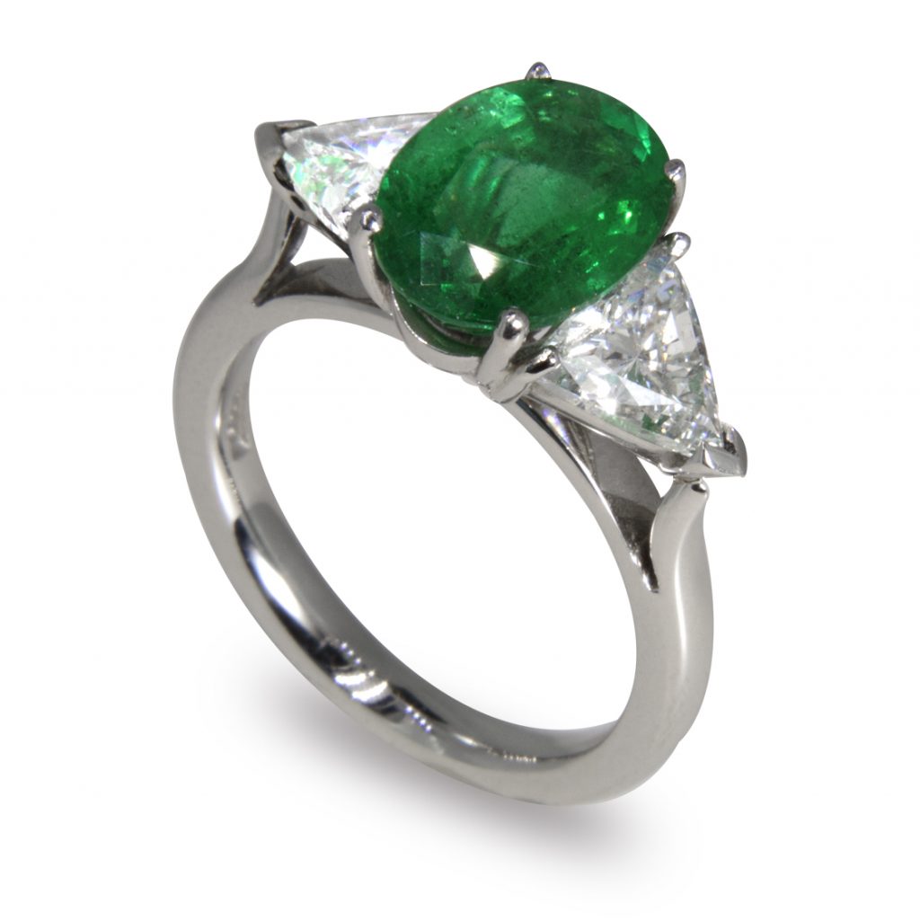 A truly modern trilogy featuring a Colombian Oval Cut Emerald (2.58ct) centre stone flanked by 2 Triangle Cut  Diamonds  (1.51ct tw) set on Platinum 950.