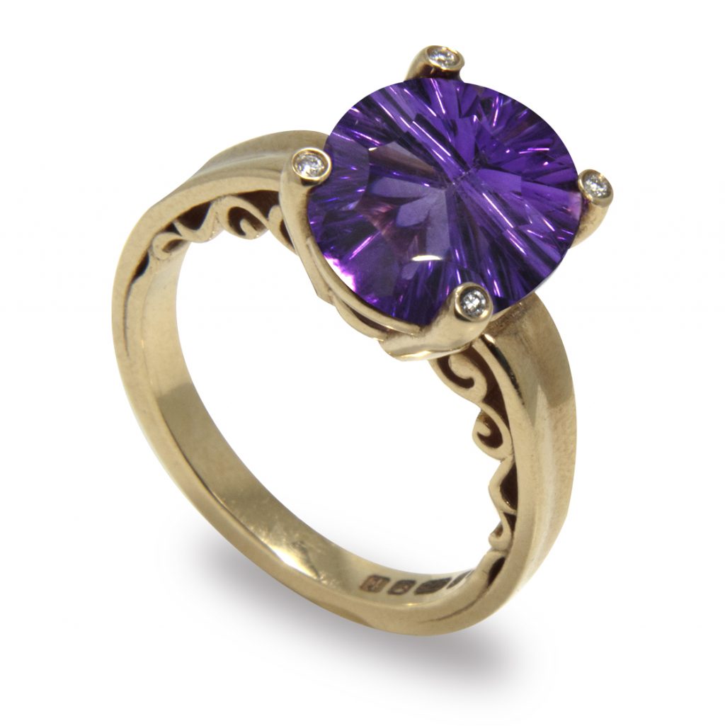 A stunning Soleil Oval Cut AAA Amethyst set on a scrolled design 9K Yellow Gold band with Diamond (0.012ct tw) tipped prongs.
