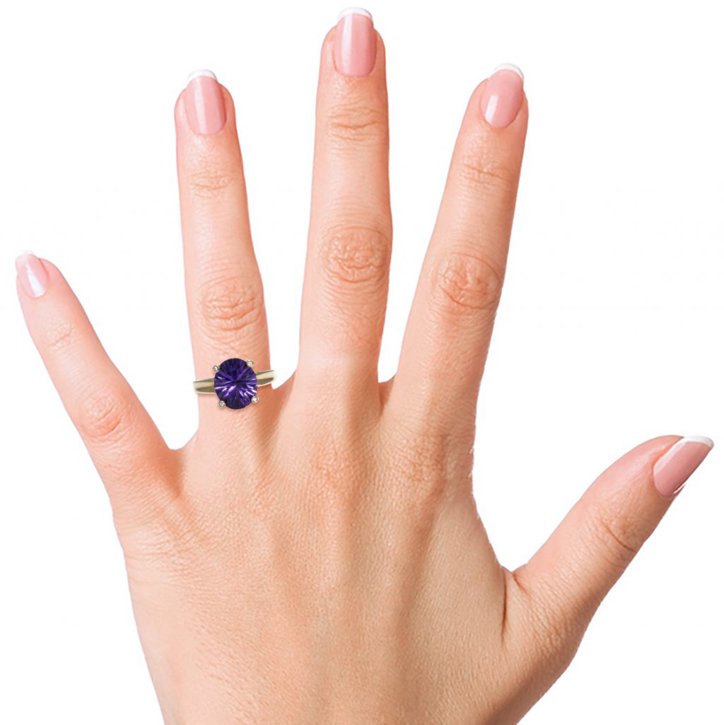 A stunning Soleil Oval Cut AAA Amethyst set on a scrolled design 9K Yellow Gold band with Diamond (0.02ct tw) tipped prongs.