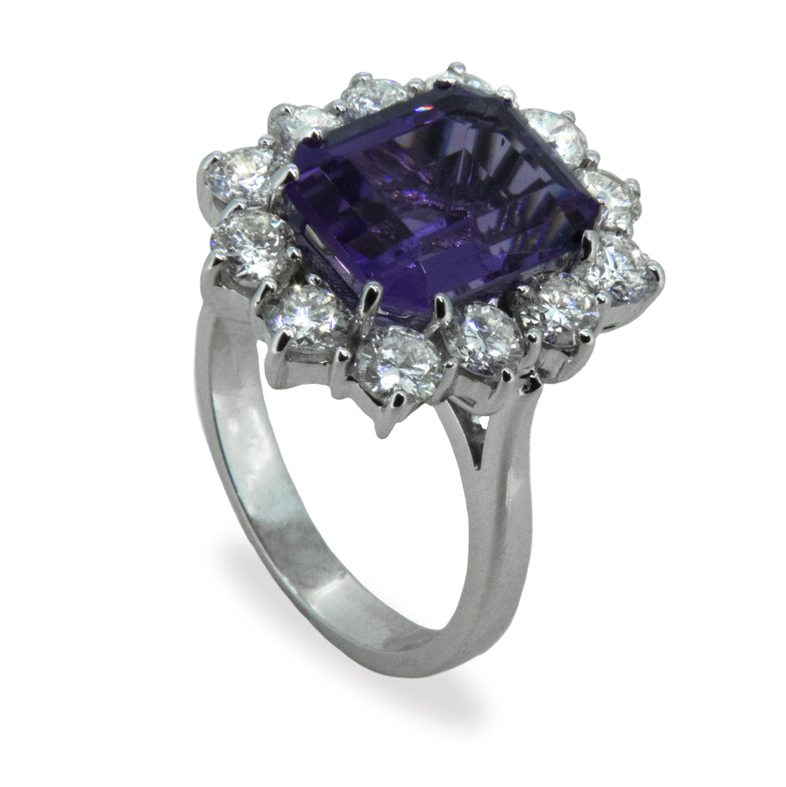 This utterly indulgent Amethyst and Diamond Cluster Platinum 950 ring features a stunning 4.0ct Emerald Cut Amethyst, personally selected by Julia Pharo, claw set with meticulous attention to detail amidst a cluster of dazzling F-G Colour SI1 Diamonds boasting an impressive 1.68 total carat weight.