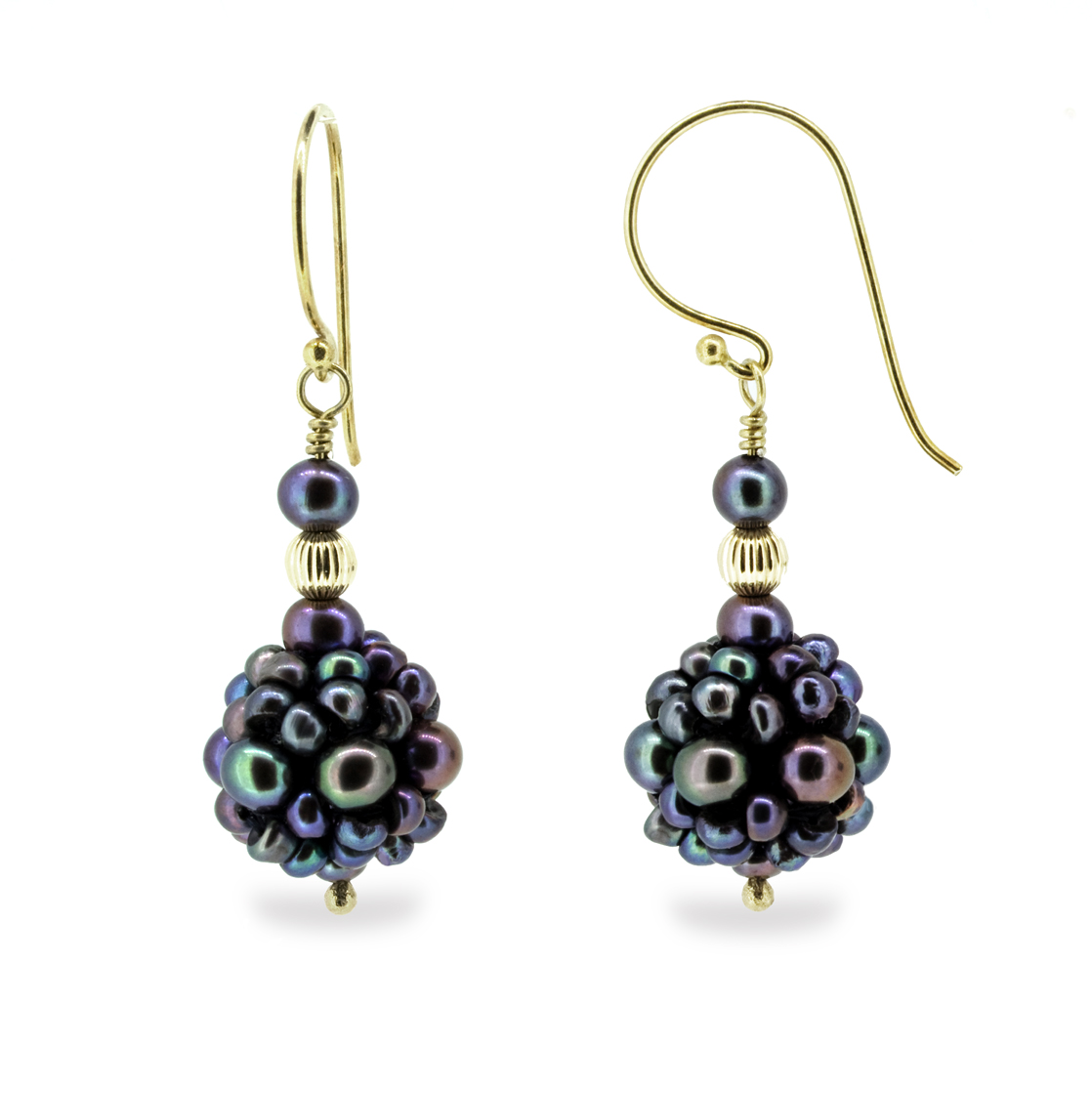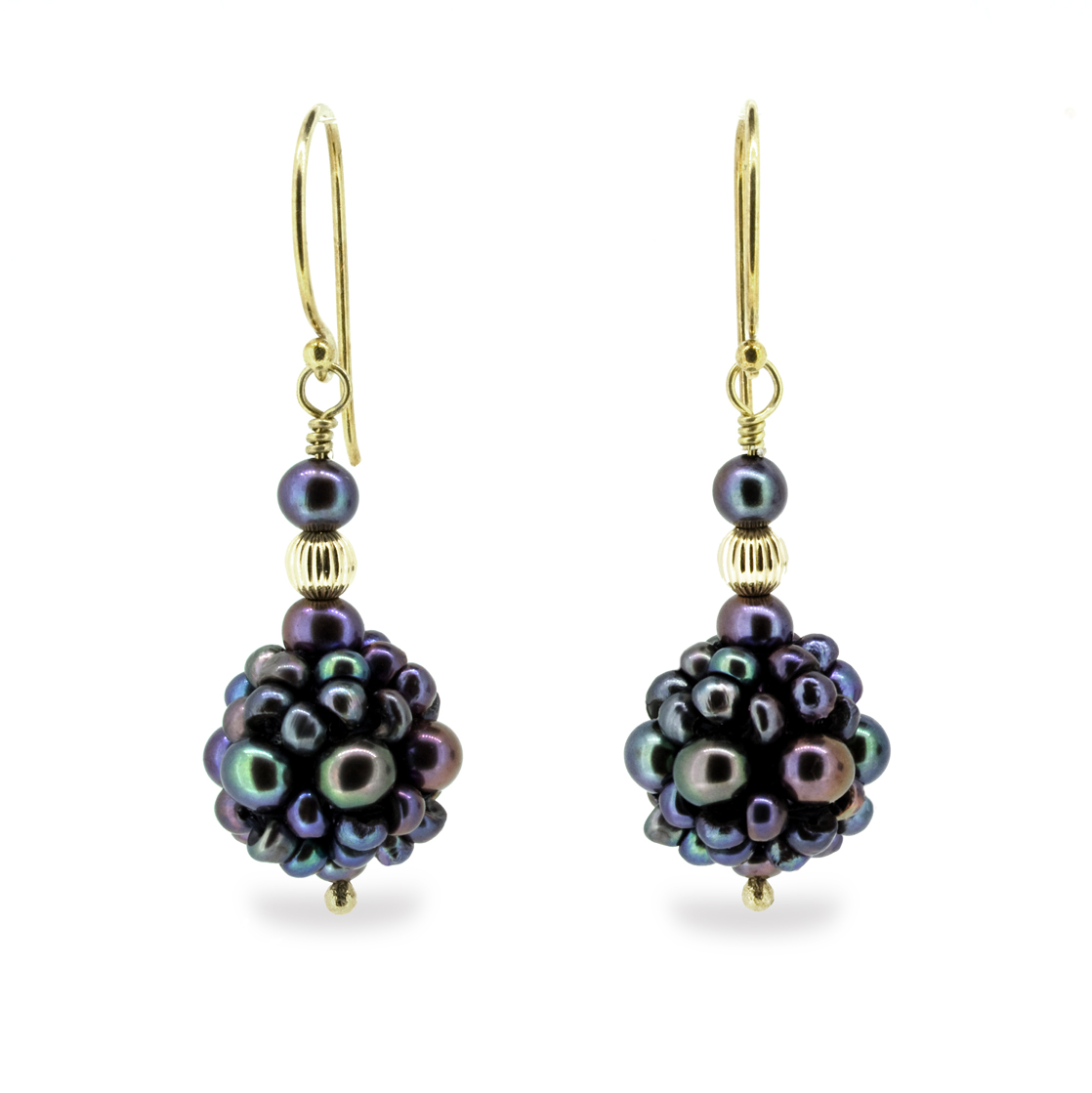 These opulent drop earrings feature AAA quality Cultured Freshwater Pearls, lovingly hand woven to create the most beautiful pearl cluster “blackberries” suspended on 14K Gold.