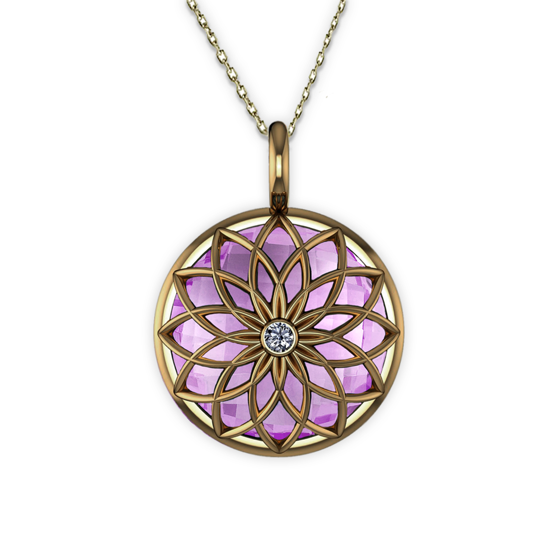 Fully reversible, this Amethyst amulet may be worn “Protéger” with the gemstone fully captured in a web of 18K Gold reflecting the gemstone’s energy to the wearer, or “Émettre”, the gemstone only lightly veiled in 18K gold to radiate its energy to others.
