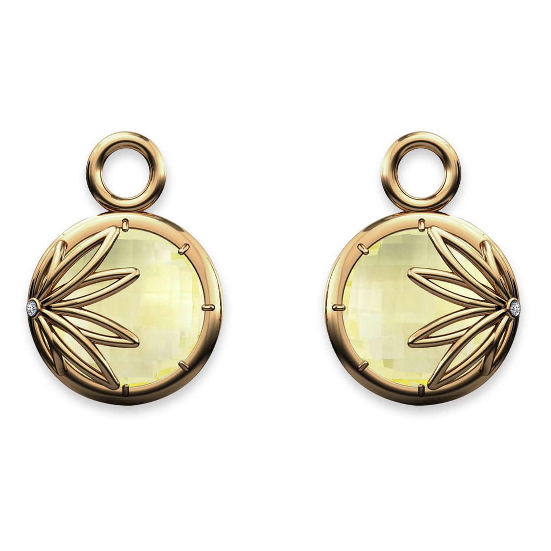 The specially cut 12mm (approx) Lemon Quartz are captured in 18K Gold amulets enhanced with 0.04 tcw of F Colour, VS1 Diamonds.