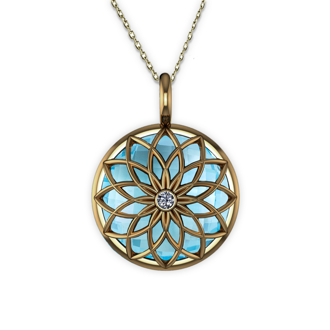 This impressive 16mm (approx) Sky Blue Topaz amulet is suspended on an 18K Gold extender chain, allowing the chain length to be worn at 16″ (40cm), 17″ (42,5cm) and 18″ (45cm).