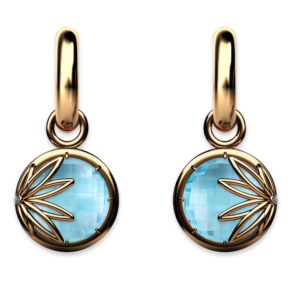 The specially cut 12mm (approx) Sky Blue Topaz are captured in 18K Gold amulets enhanced with 0.04 tcw of F Colour, VS1 Diamonds and suspended on 18K Gold hoop earrings with a total drop length of 30mm (approx).