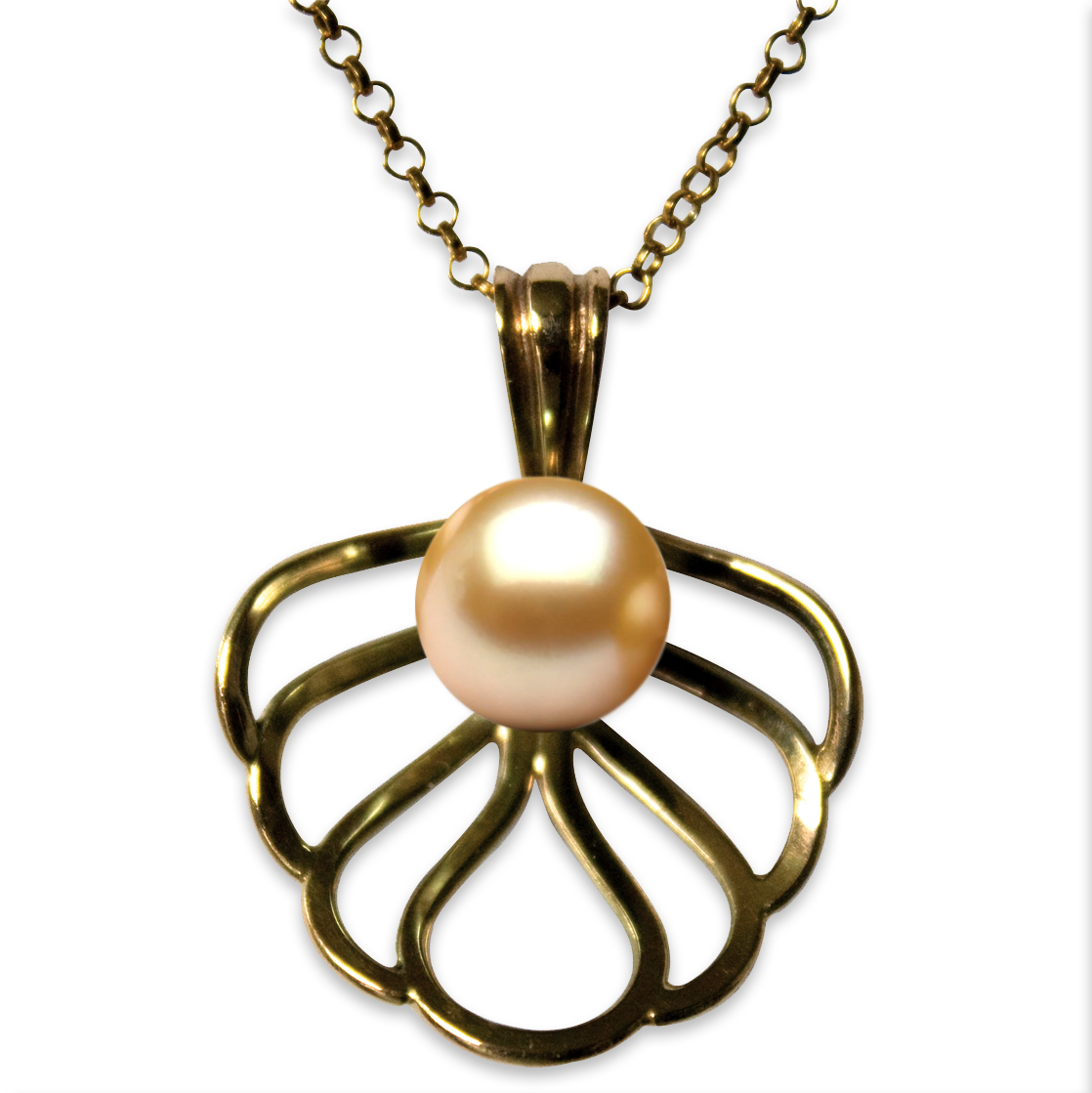 A stunning 9mm Cultured Golden South Sea Pearl is illuminated by the soft glow of this substantial 18K Gold pendant, available in your choice of Yellow Gold, Rose Gold or White Gold.