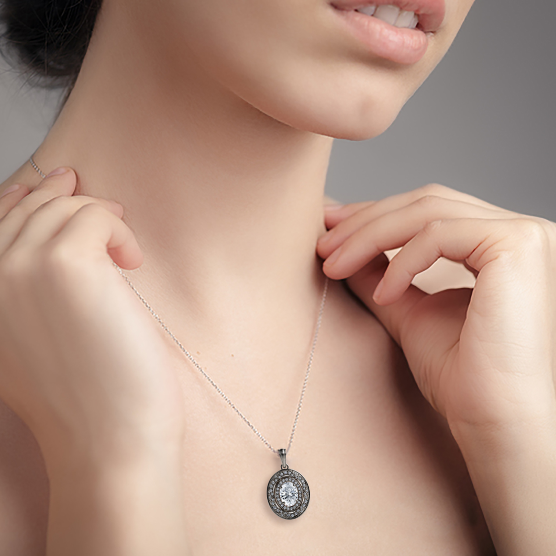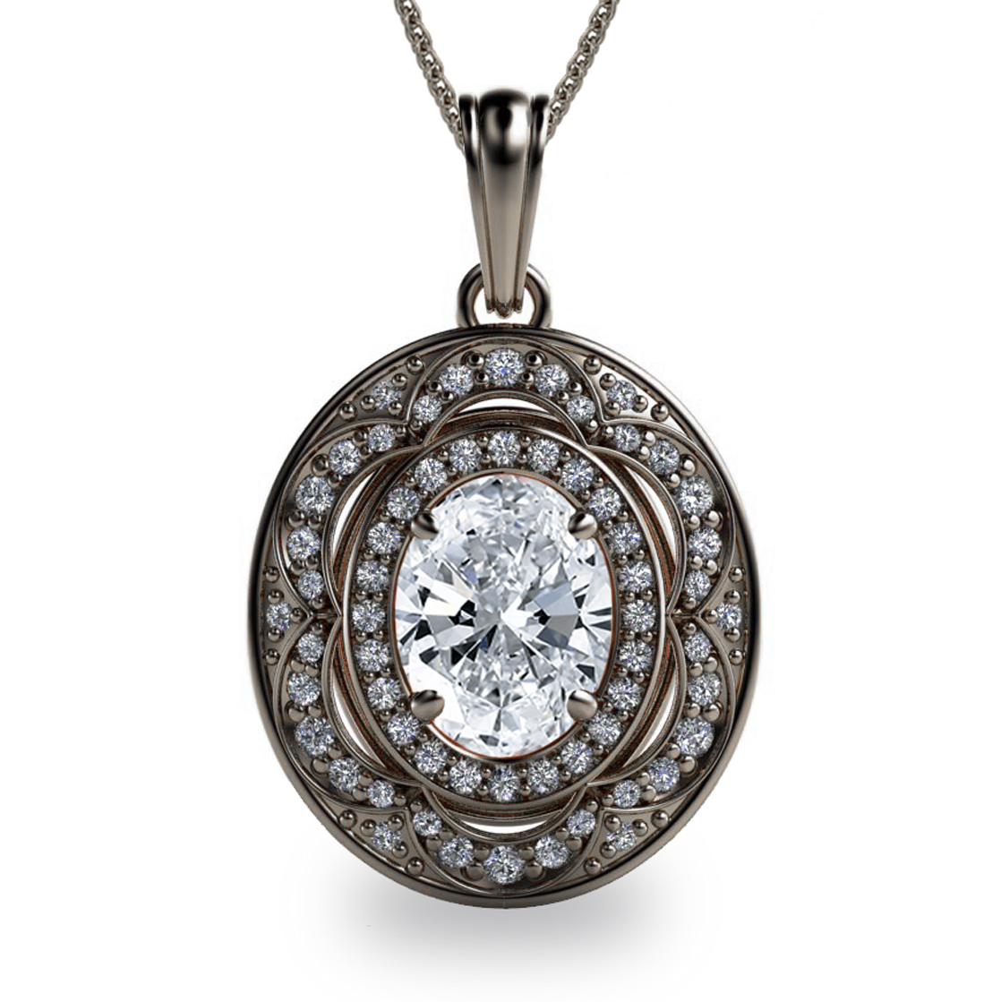 Featuring a spectacular 2ct. Oval Diamond (Colour: F; Clarity: SI 1) set in a brightly polished Platinum 950 pendant with a double halo of 62 Round Brilliant Cut Diamonds (Carat: 0.33ct. tw Colour: F; Clarity: VS1).