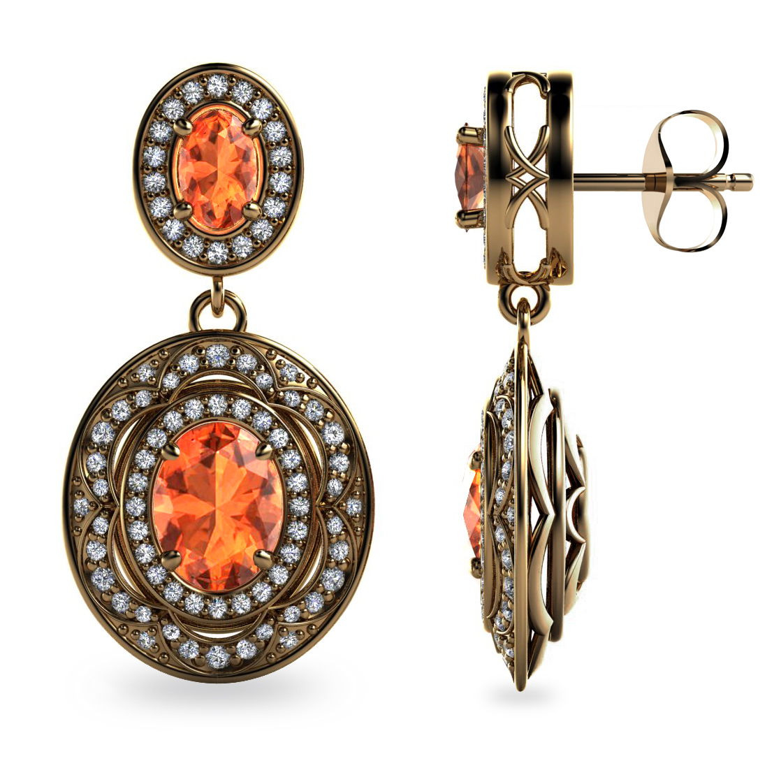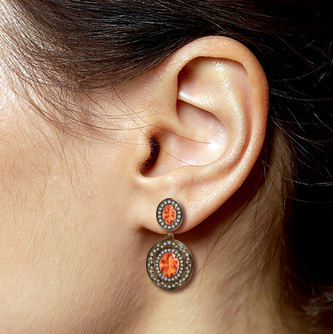 With colours reminiscent of an Indian spice market, these impressive Oval Mandarin Garnets (3.50ct tw) radiate soft turmeric tones through to strong burnt orange and are surrounded by 156 small Round Brilliant Cut Diamonds (F/VS1/0.93ct tw) set in an ornate 18K Gold double halo design.