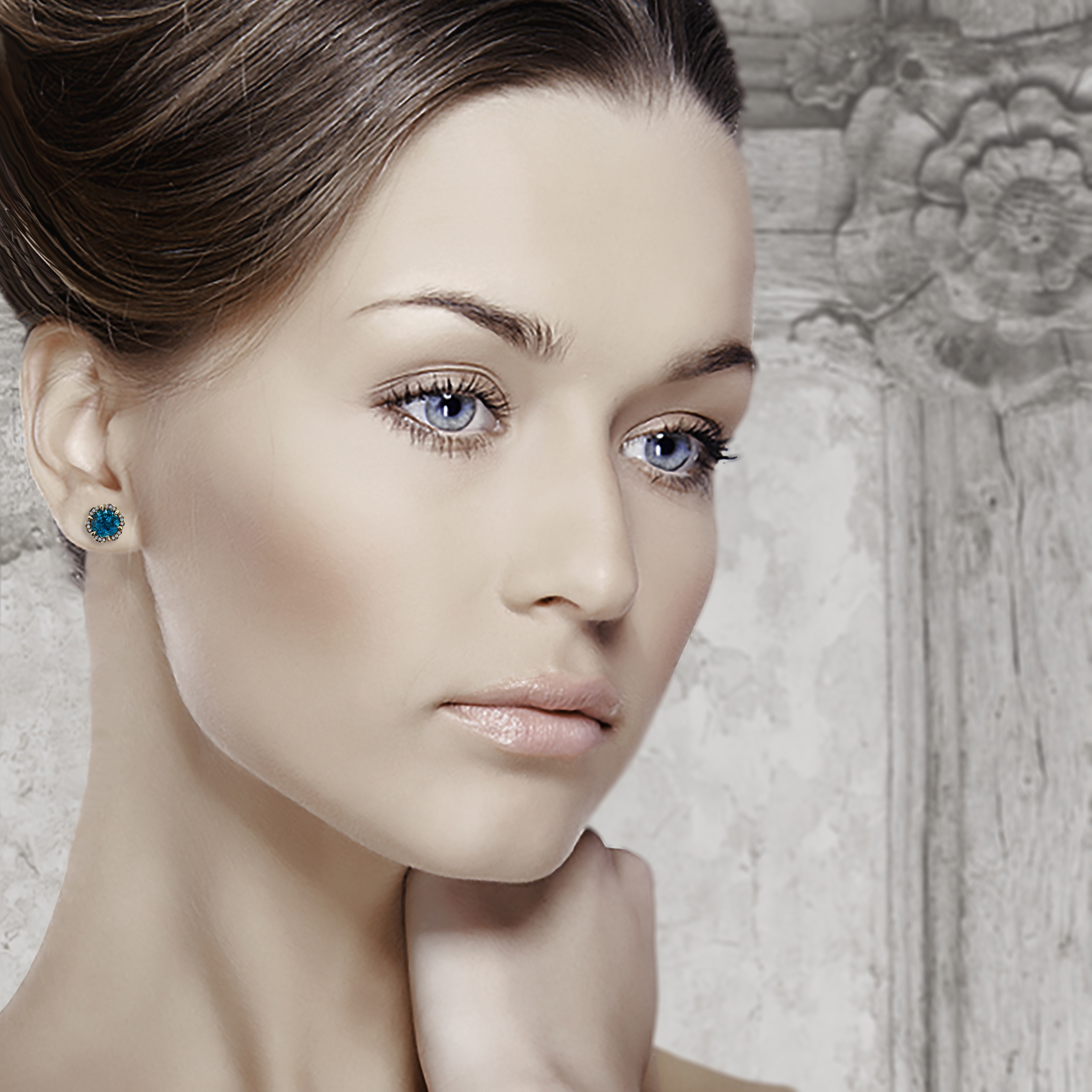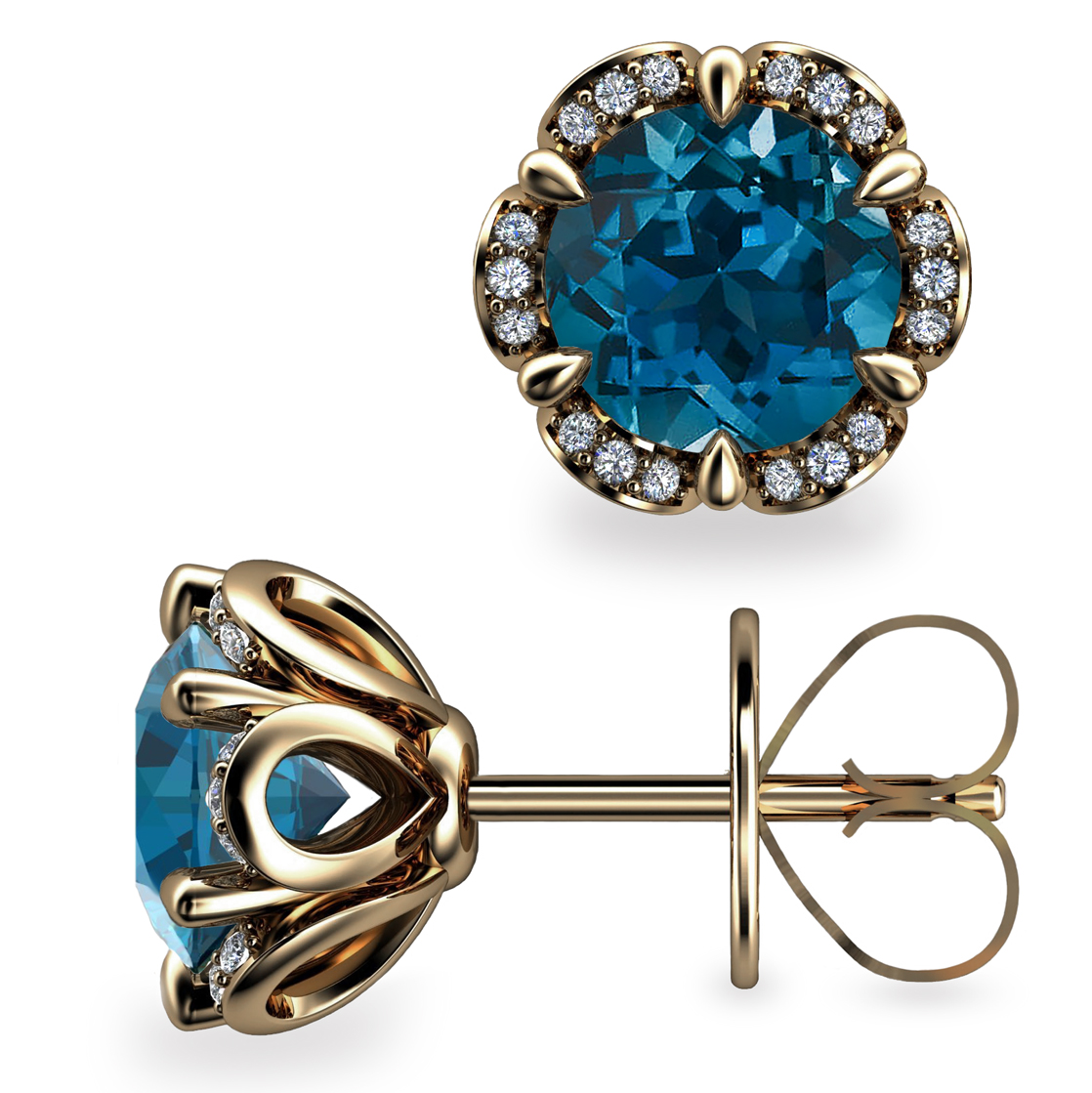 These sumptuous 2ct. London Blue Topaz Tudor Rose earrings feature 2x 1ct Round Faceted London Blue Topaz securely held by thorn shaped prongs in a ring crafted from 18K Gold.