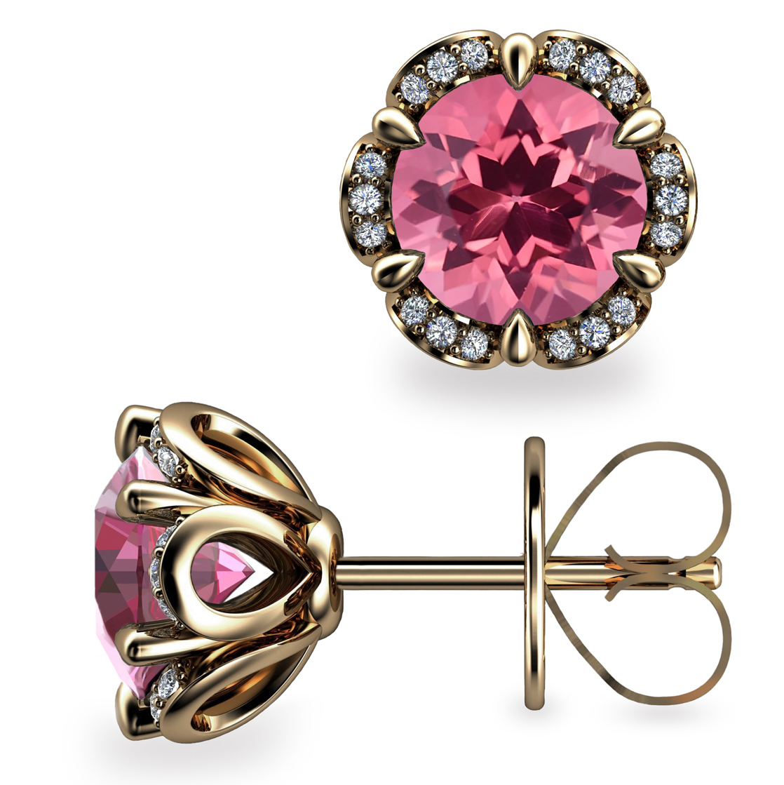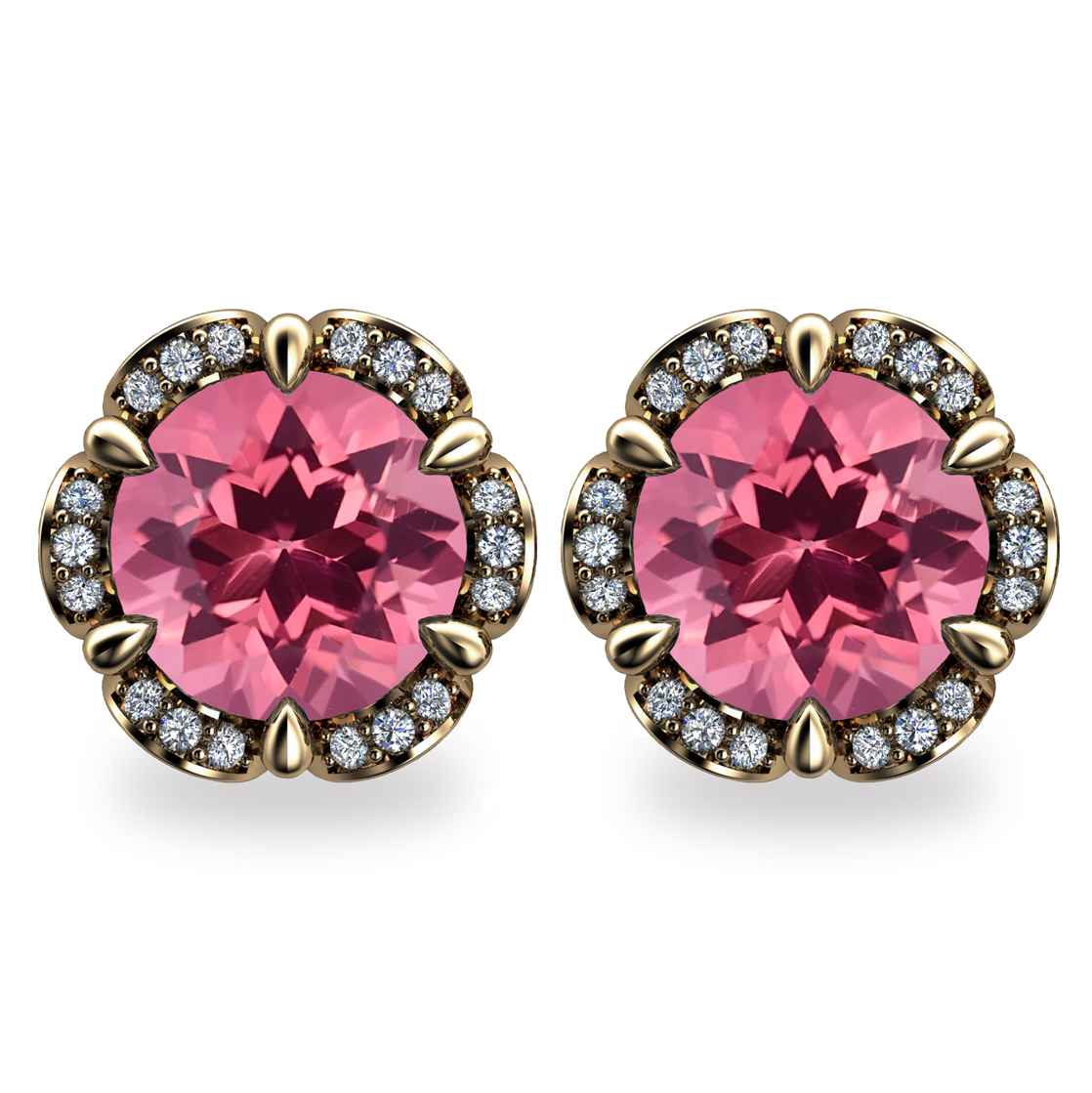 These sumptuous 2ct. Pink Tourmaline Tudor Rose earrings feature 2x 1ct Round Faceted Pink Tourmalines securely held by thorn shaped prongs in a ring crafted from 18K Gold.