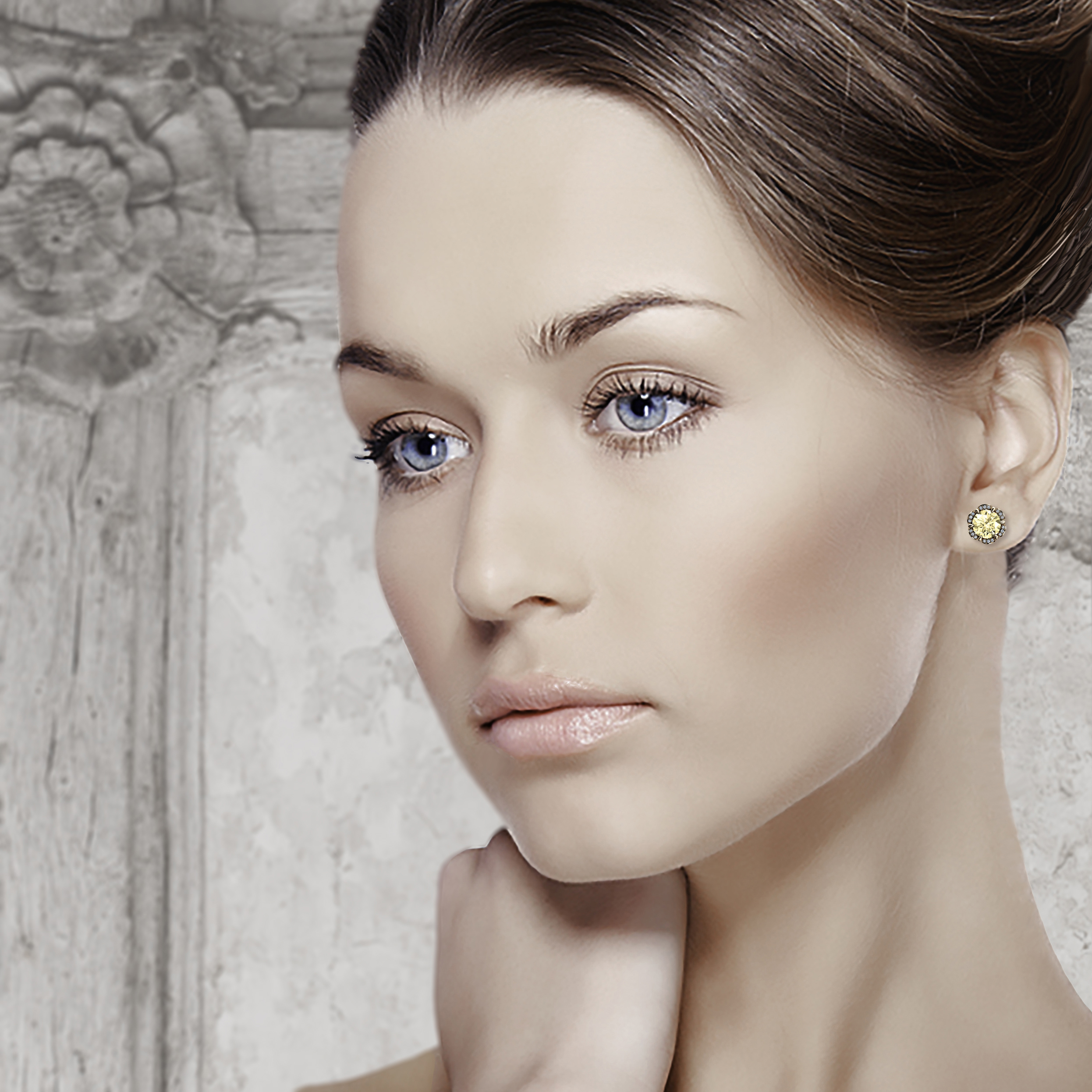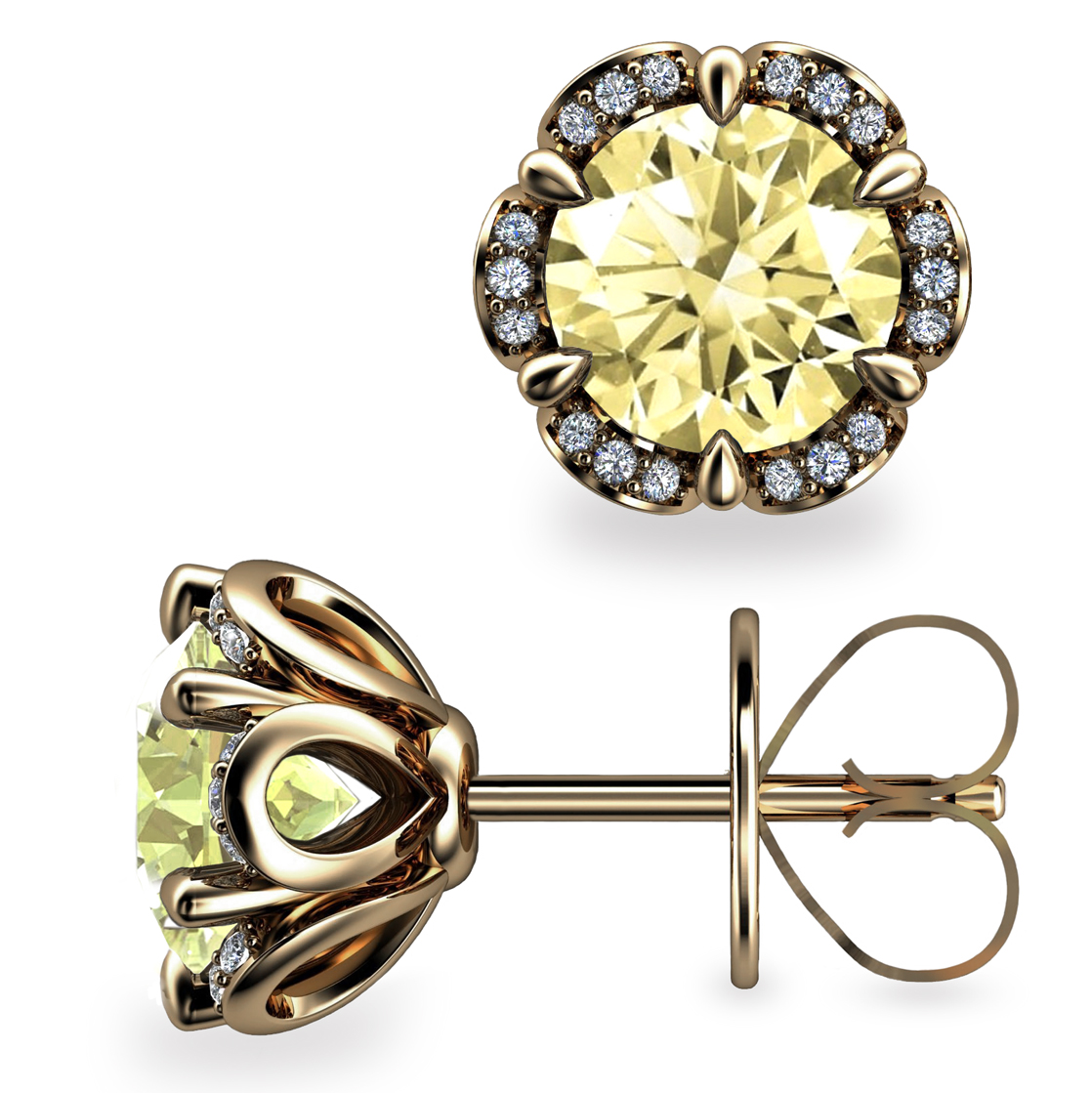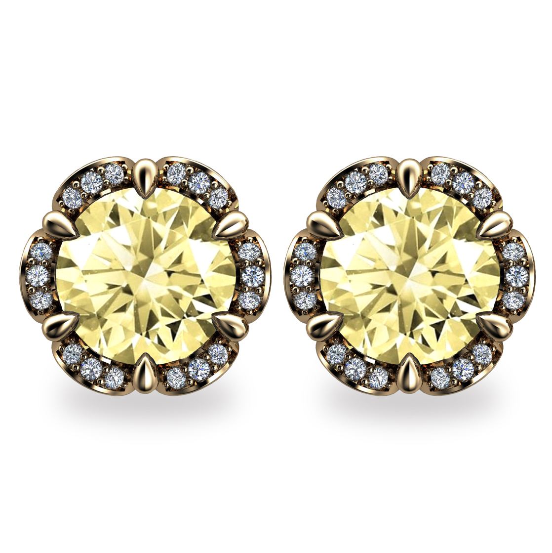 These sumptuous 2ct. Fancy Yellow Diamond Tudor Rose earrings feature 2x 1ct Round Brilliant Cut Fancy Yellow Diamonds (VS1-2) securely held by thorn shaped prongs in a ring crafted from 18K Gold.
